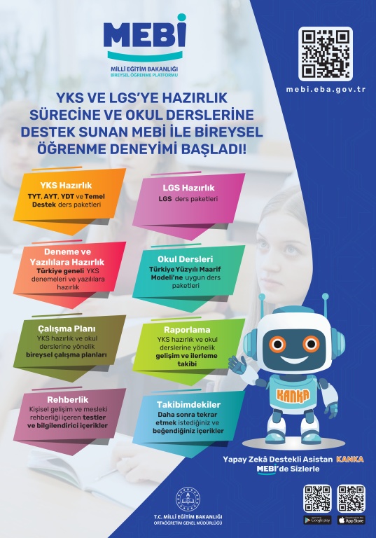 Bakanlık, lise düzeyindeki öğrencilerin üniversiteye hazırlık sürecinde hedeflerine daha etkin şekilde ulaşabilmesi için yapay zekâ destekli bireysel öğrenme platformu MEBİ'yi geçen yıl hayata geçirmiş, platformu kullanan öğrenci sayısı kısa sürede 1 milyonu geçmişti. MEBİ, platformdan ortaokul öğrencilerinin de yararlanması için 5, 6 ve 8'inci sınıfların kullanımına açıldı. Bu kapsamda MEBİ, eğitimde fırsat eşitliğini güçlendirmek için Temel Eğitim Genel Müdürlüğü tarafından yürütülen çalışmalar sonucunda Türkiye Yüzyılı Maarif Modeli Öğretim Programları ve Liselere Geçiş Sistemi (LGS) çerçevesinde zenginleştirildi. Bu doğrultuda, yeni müfredatın uygulandığı 5 ve 6'ncı sınıf düzeylerinde MEBİ'de Din Kültürü ve Ahlak Bilgisi, Türkçe, Matematik, Fen Bilimleri, Sosyal Bilgiler ve İngilizce derslerine yönelik olarak, "Hazır bulunuşluk Soruları", "Konu Anlatım Videoları", "Beceri Temelli Etkileşimler", "Etkinliklerle Öğren", "Bağlam Temelli Sorular" ve "Oynayarak Öğren" içerikleri hazırlandı. Ortaokul son sınıf düzeyinde ise platformda din kültürü ve ahlak bilgisi, Türkçe, matematik, fen bilimleri, İngilizce ile T.C. İnkılap tarihi ve Atatürkçülük derslerine yönelik olarak "Hazırbulunuşluk/Hazırlık Testleri", "Çıkmış Sorular", "Değerlendirme Testleri", "Soru Çözüm Videoları", "Konu Anlatım Videoları", "Konu Özetleri, Deneme ve Tarama Sınavları" bölümleri yer aldı. MEBİ'de ortaokul öğrencileri için ilk etapta toplam 156 konu anlatım videosu bulunuyor Öğrenme süreçlerinin tamamen kişiselleştirilebildiği MEBİ'de ortaokul öğrencilerine yönelik içerikler oluşturuldu. Bu kapsamda ilk etapta MEBİ'de 5'inci sınıf için 43 konu anlatım videosu, 106 etkileşimli içerik, 189 hazır bulunuşluk sorusu, 579 değerlendirme sorusu, 165 etkinlik, 43 oyunlaştırılmış içerik ve 156 bağlam temelli soru yer alıyor. 6'ncı sınıf için de 54 konu anlatımı videosu, 116 etkileşimli içerik, 187 hazır bulunuşluk sorusu, 891 değerlendirme sorusu, 531 etkinlik, 58 oyunlaştırılmış içerik ve 392 bağlam temelli soru bulunuyor. 8'inci sınıf öğrencileri için ise öğrencilerin LGS hazırlık sürecini destekleyecek şekilde 59 konu anlatımı videosu, 59 konu özeti, 583 soru çözümü, 468 değerlendirme sorusu, 232 hazır bulunuşluk sorusu ve 351 çıkmış soru hazırlandı. Toplamda platformda 156 konu anlatımı videosu, 222 etkileşimli içerik, 608 hazır bulunuşluk sorusu, 1938 değerlendirme sorusu, 696 etkinlik, 101 oyunlaştırılmış içerik, 548 bağlam temelli soru, 59 konu özeti, 583 soru çözümü ve 351 çıkmış soru öğrencilere sunulmuş oldu. Öğrencinin öğrenme izleri takip edilebiliyor "MEBİ", öğrencilerin kendi hızlarında yeni bilgi ve beceriler öğrenmelerine olanak tanıyan tam öğrenme yaklaşımını merkeze alarak tasarlandı. Yapay zekânın etkin kullanıldığı MEBİ'de sistem, öğrencilerin öğrenme izlerini takip ediyor ve süreç içerisinde öğrencinin çalışma planını yeniden şekillendirmesine olanak sağlıyor. Mobilden erişime uygun olmasıyla öğrenme deneyiminin istenildiği zaman devam ettirilebilmesine olanak sağlayan MEBİ'de öğrencilerin üniversite sınavında hedeflerine daha etkin ulaşabilmesi için YKS'ye ilişkin denemeler de yer alıyor. MEBİ'nin dijital kaynakları ve interaktif materyalleri, öğrencilerin derslerini pekiştirmelerine, konu tekrarlarını istedikleri zaman yapabilmelerine ve öğrenme sürecine aktif katılımlarına da imkân sağlıyor. Mezun öğrencilerin de kullanabildiği bireysel öğrenme platformuna, "mebi.eba.gov.tr" adresinden ve mobil uygulama marketlerinden erişilebiliyor.